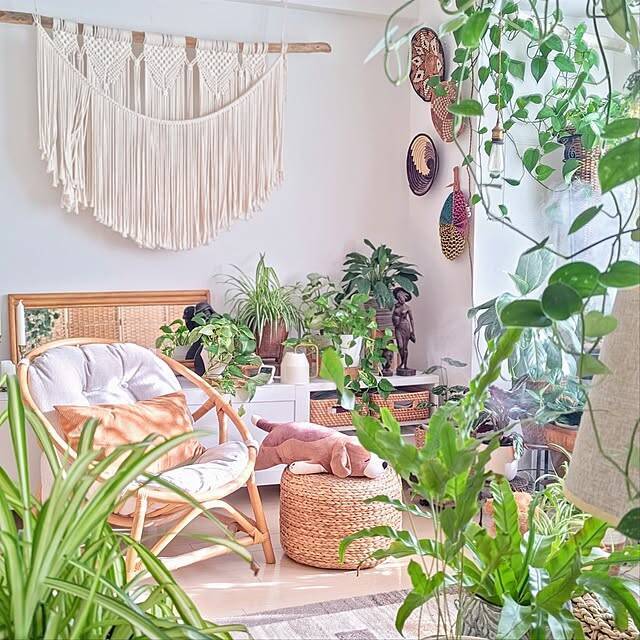 ナチュラルな家具で統一されたYuriYuriさんのお宅のインテリアです。ふんだんに置かれた植物がみずみずしい雰囲気で、居心地よく整えられていますね。手作りというマクラメタペストリーが、インテリアの良いポイントになっています。