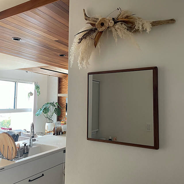 運営チームが選んだのは、komeさんの投稿です。ウォルナットフレームのミラーが、空間のアクセントとして存在感を放っていますね。ナチュラルトーンのインテリアと調和し、ドライフラワーとの組み合わせも絶妙です。