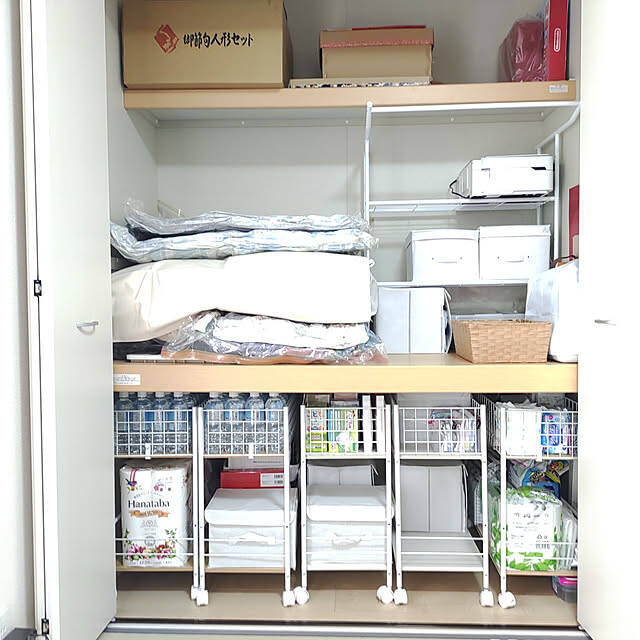押入れ収納に、ニトリのワゴンを活用しているkouさんの実例です。キャスター付きのワゴンは、出し入れがしやすくて良いですね。こちらには災害用ストックや、 生活用品のストックを収納されているそうです。