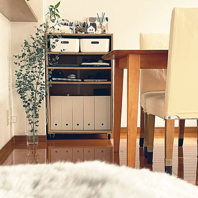 無印良品のスタッキングシェルフを活用しているMAYUさん。引き出しやファイルボックスなど、組み合わせによっていろんなアイテムが収納できています。棚の上も、観葉植物を置くなどリビングの飾り棚として使うことができますね!