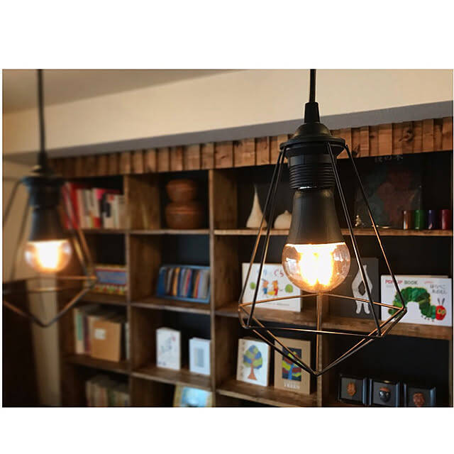 DIY初心者とおっしゃるユーザーさんです。ダイソーのテラリウムオーナメントとIKEAのHEMMAコードセットを組み合わせて、アイアンシェードを作っていました。落ち着いた色味とオレンジ色の明かりが雰囲気たっぷりです。カッコいい空間になっていますね。