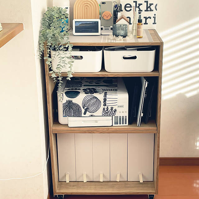 wakoさんは、デスク足元に設置されたプリンターラックに、ノートパソコンを収納されていましたよ。ノートパソコン以外に、プリンターやwi-fi、コピー用紙など、仕事に必要なものがこちらにまとまっているそう。必要に応じて引き出して使用できるキャスター付きの棚を選ばれているので、とっても使いやすそうです。