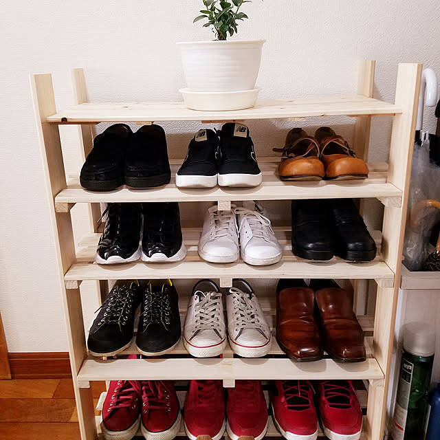 こちらの実例では、すのこを組み合わせて5段のシェルフを作っています。各段に3組ずつ収納できていて、計12足もの靴が並んでいますね。すのこの形状を利用したシンプルなデザインは、どんなインテリアにも自然と馴染みそうです。一番上には観葉植物ものせ、癒しのナチュラルスタイルに仕上がっています。