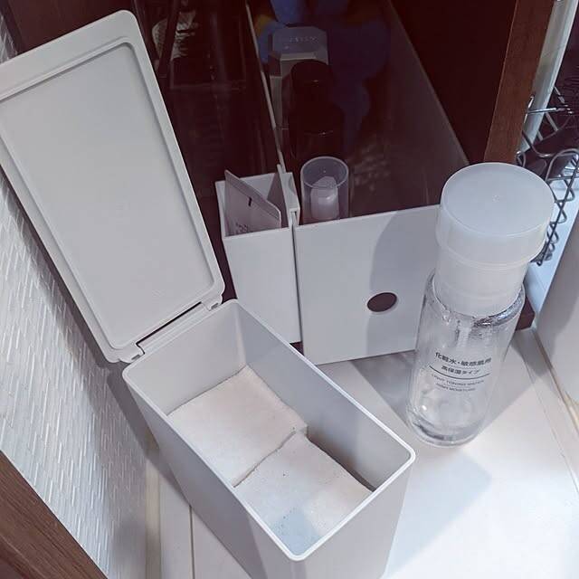 容量約0.9Lと、とてもコンパクトな「ポリプロピレンごみ箱・角型・ミニ」。ゴミ箱としてだけでなく、小物入れとしても便利なサイズ感です。ユーザーさんは洗面脱衣所の棚に置き、コットン入れとして活用されています。フタ付きなのでホコリも入らず衛生的ですね。