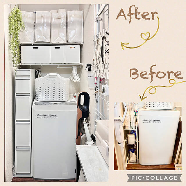 ユーザーさんが洗濯機と壁の隙間に置かれているのは、無印良品の「収納ストッカー」です。こちらのアイテムは、基本の本体に別売りの引き出しを追加できるのが魅力。引き出しを2つ増やして、スペースいっぱいの高さにしたそうですよ。キャスターも付いているそうなので、洗濯機の奥も楽に掃除ができますね。