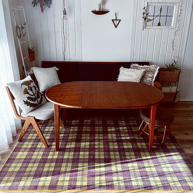 こちらのユーザーさんは、赤みのあるブラウンのダイニングテーブルを使っています。ブラウンがラグやクッションの柄ものと調和して、温かみのある空間になっていますね。楕円形のテーブルとソファーの横幅が合っていて、とても使いやすそうです。