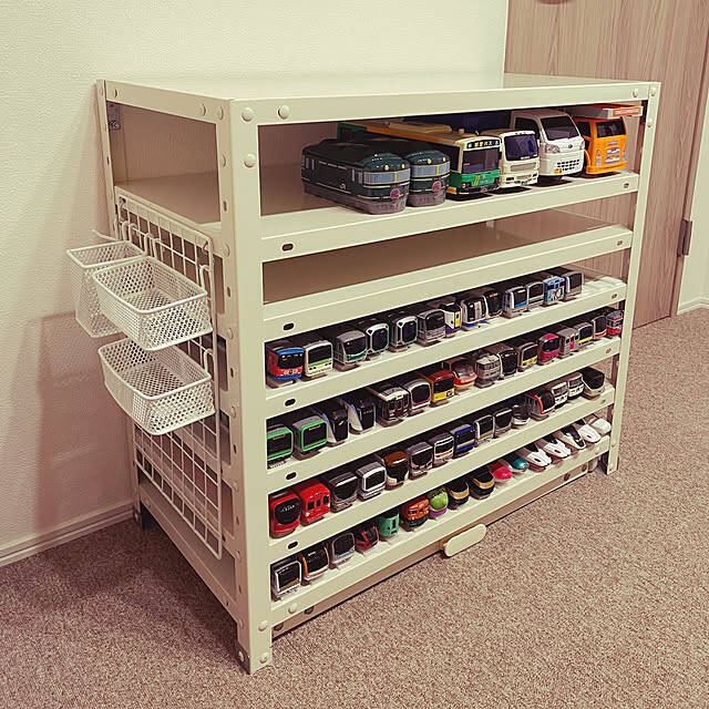 キタジマのスチールラックを使用されている、PINKさん。ベッド横に設置して棚板を増やし、お子さんのおもちゃを収納されました。プラレールのサイズにもぴったりで、無駄のない美しい収納ですね。スチールラックのサイドも収納にフル活用されています!