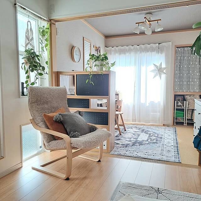 リビングのソファの隣にポエングのロッキングチェアを設置しているユーザーさんです。上には白いラグも設置して、より心地よさそうな空間に仕上げていますね。下にはラグが敷かれているので、ゆらゆら揺れるのを安心して楽しめそうです。