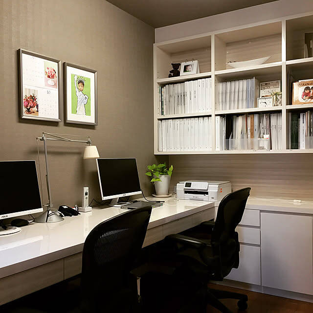 greengreenさんは、2畳の書斎でリモートワークをしているそう。コーナーにフィットするIKEAのデスクで、2畳のお部屋とは思えないほど広々とした作業スペースを確保しています。デスクの上にはプリンターを置き、少し手を伸ばすだけですべてにアクセスできるレイアウトが実現していますね。