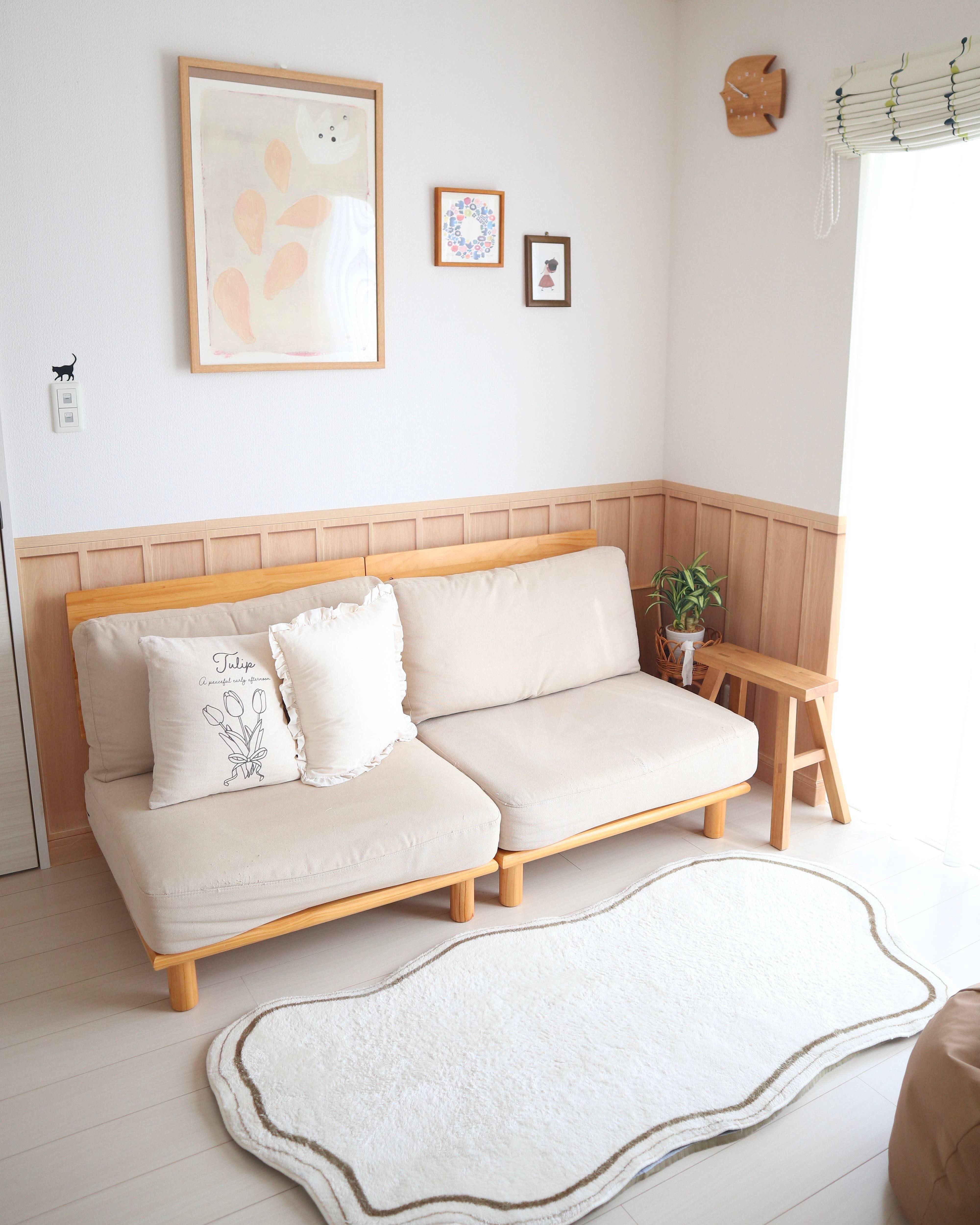 sayaka.さん「天然木のフレーム×麻100%の生地、優しいカラーで、ナチュラルインテリアによく馴染んでくれるところが気に入りました。背もたれと座面が取り外せるので、お手入れしやすいのも良いです。