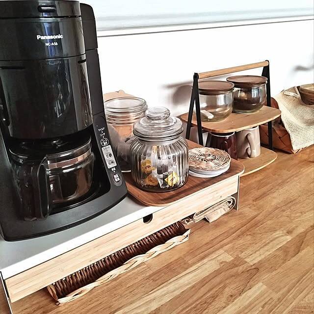 最後は、キッチンの棚やカウンターにコーヒーグッズを収納されている実例をご紹介します。置くスペースや使い方に合わせて、収納アイテムをDIYされているユーザーさんもいらっしゃいますよ。