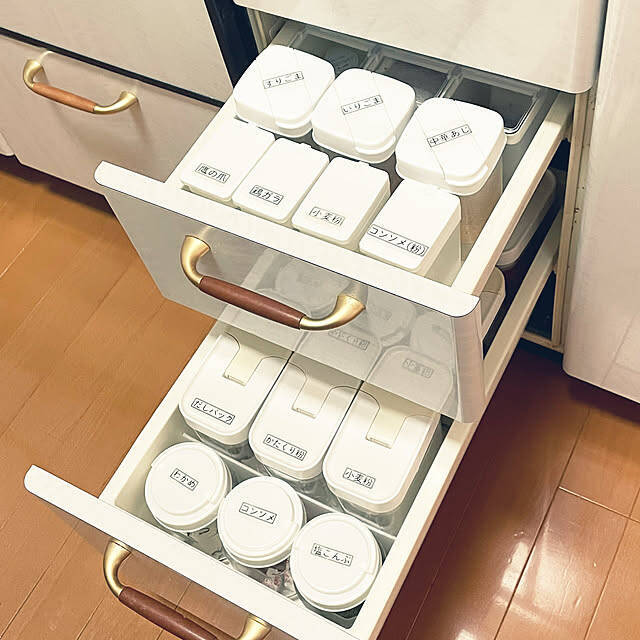kawauso15さんは、キッチンの引き出しに調味料を収納されていました。使用されているケースは、すべて100均のものだそうです。白いフタで統一されており、スッキリとした見た目ですね。さらに、ラベルを貼って一目で中身がわかる工夫もされていましたよ。これならお料理がスピーディーに進められそうですね。