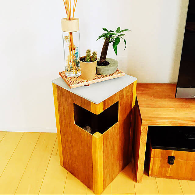 モルタルと木材を使って、ゴミ箱をDIYしているktm6365さんの実例です。上部にものが置ける作りは、ディスプレイにぴったりで良いですね。ゴミの入れ口を正面にしていないところも、ユニークかつハイセンスです。