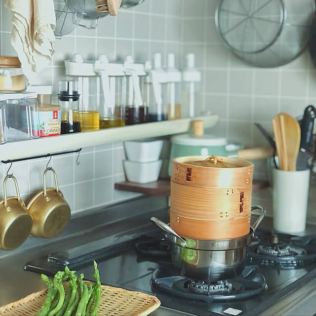 sikiさんは、サイズ違いの2つのせいろを使っています。写真左の無印良品の「せいろ大」は、深さがあるので中に器ごとすっぽり入るのだそうです。お手入れも水洗いして干すだけと簡単で、乾いたら吊るして出しっぱなし収納にしているとのことです。