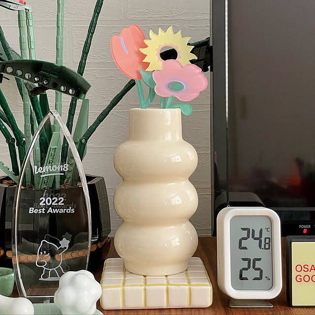 スリコのColorful interia♪アクリルフラワーとフラワーベースとタイル風トレーを組み合わせたら、めちゃくちゃ可愛いです!
