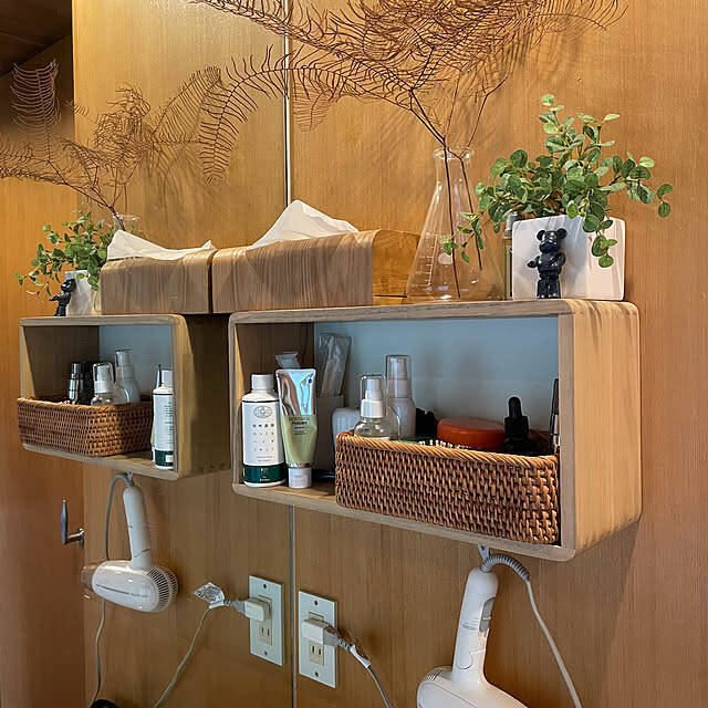 kabu10さんは、洗面所収納としてベルメゾンの角が丸い設置簡単ウォールシェルフを使っていました。オープン収納で出し入れもしやすく、壁面を生かすことでスペースの有効活用にもつながりますよ。ナチュラルな素材感で統一された、まとまりのあるコーディネートも素敵です。