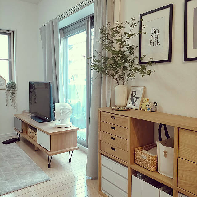 こちらの実例では、リビングに置かれた木製の棚の上にドウダンツツジを飾っています。白い花瓶が棚の中の収納とよく似合っていて、ナチュラルインテリアにぴったりですね。スペースに合ったサイズ感の枝で、ほどよくグリーンの色合いを加えてくれています。