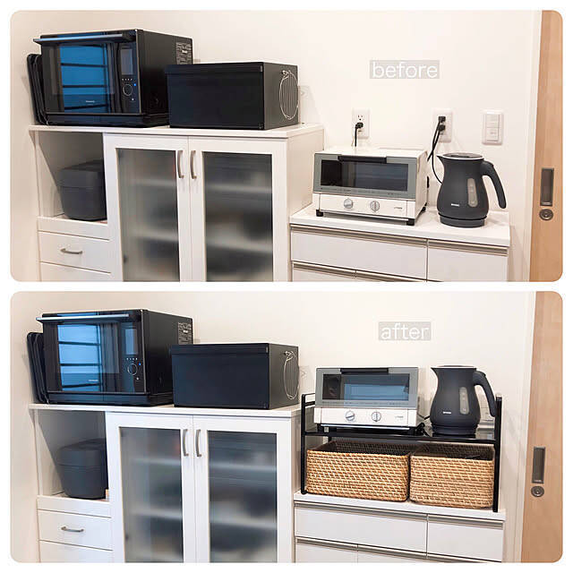 トースターラックを購入したというこちらのユーザーさん。ラックを使ったおかげで、コンセントが丸見えになるのを防ぐことができ、収納まで確保できていますね。下の空いたスペースには無印良品のラタンバスケットを入れ、見た目もすっきり仕上げています。
