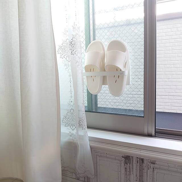 ベランダサンダルの置き場所を紹介しているSHIROYAGIさん。山崎実業の「Plate ツーウェイベランダスリッパラック」を使って、ガラスに吸盤でラックを取り付けているそうです。スリッパラックやスリッパ自体の色味をホワイトカラーにまとめることで、圧迫感を感じにくい収納になっていますね!