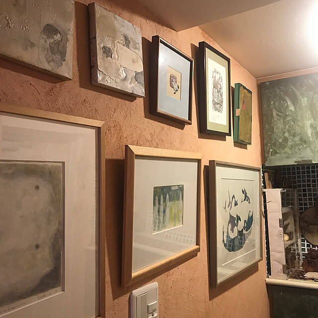 こちらの実例では、玄関で淡いピンク色の土壁をDIYしています。壁の上からたくさんのアート作品を飾っていて、美術館の一角を思わせるギャラリースペースが完成していますね。土の質感が伝わってくるような壁の仕上がりで、アートもより上質に見えます。