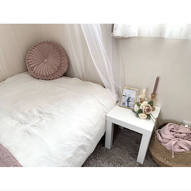 _rm_さんは、お子さんのお部屋にIKEAの「LACK」シリーズのサイドテーブルを置いています。シンプルで、おうちのあちこちで活躍してくれそうなデザインですね。くすみピンク×ホワイトで、心地のいい落ち着いたインテリアに仕上がっています。