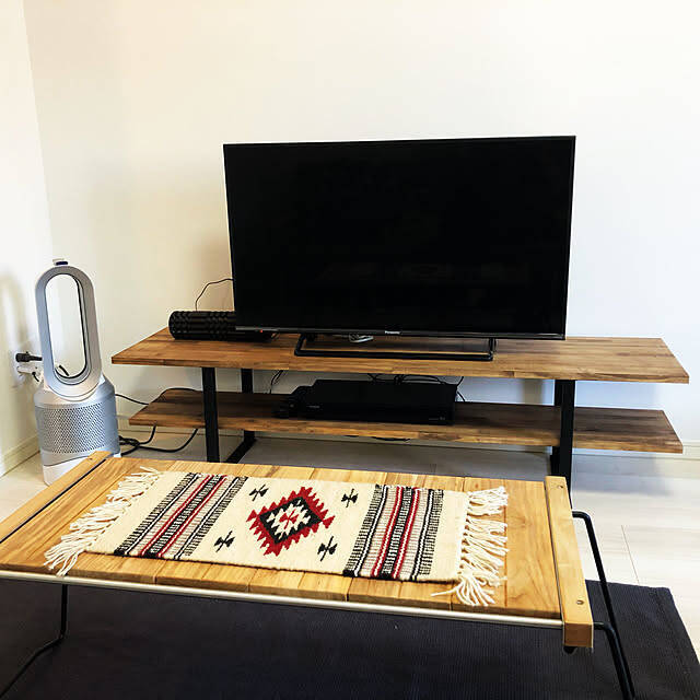 こちらの実例では、ラグの敷かれたリビングに手作りのテレビボードを設置しています。落ち着いたブラウンの板に黒の脚を合わせて、男前なテイストに仕上げていますね。キャンプ道具を使ったインテリアと相性抜群の作品で、ユーザーさんのこだわりが伝わってきます。