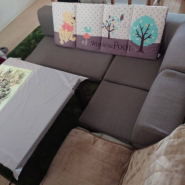 ニトリのコーナーローソファー4点セットを使われている、nononokoさん。コーナー部分が扇形になっていて、背もたれの高さに違いがあるのも特徴です。ローソファーなら、冬にこたつを置いてもそのまま快適に過ごせますよ。