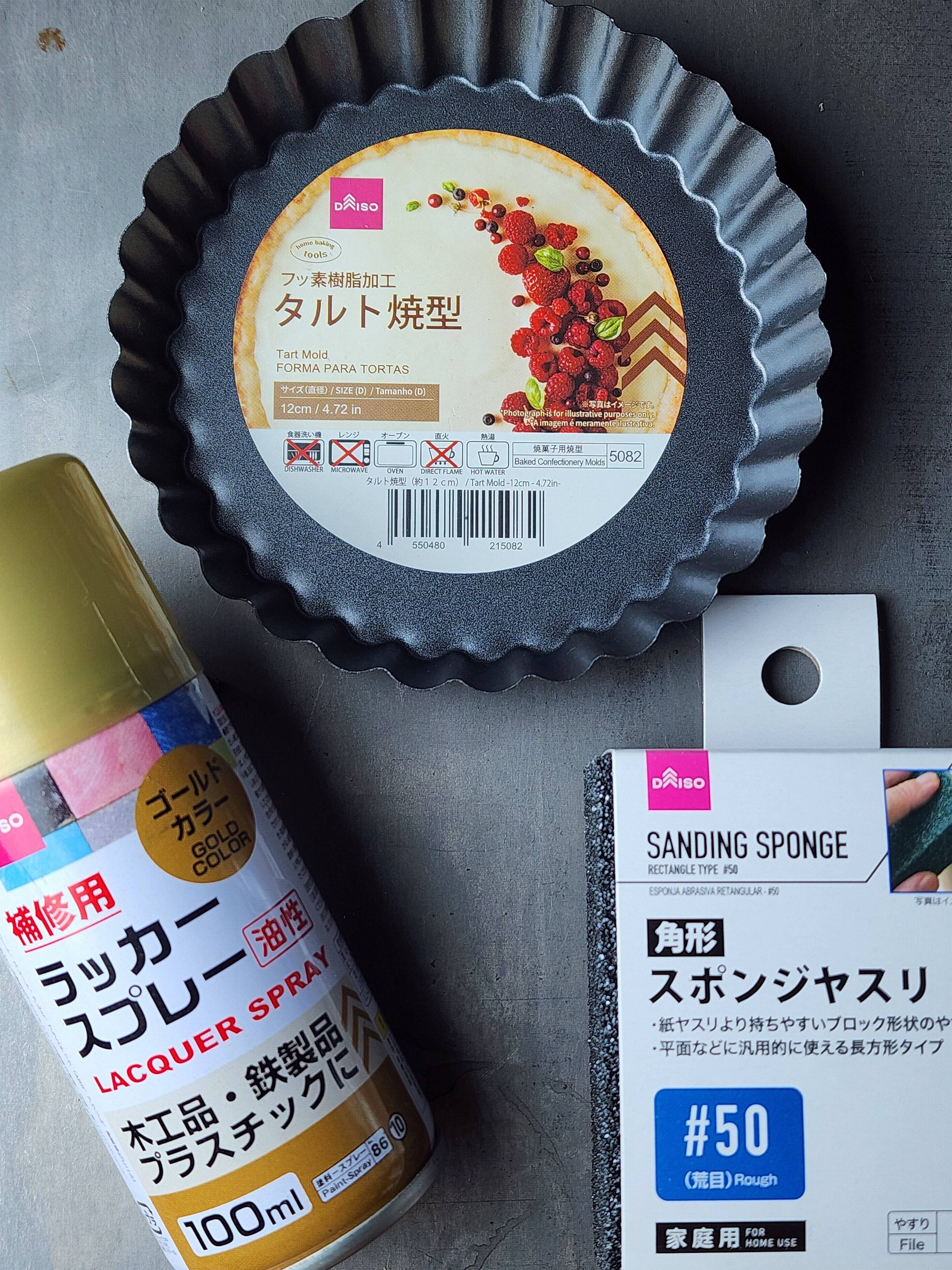 タルト焼き型【ダイソー 売場:キッチン用品】ラッカースプレー(ゴールドカラー)【ダイソー 売場:DIY材(スノコ、工具、フック等)】角型スポンジヤスリ【ダイソー 売場:DIY材(スノコ、工具、フック等)】新聞紙つくりかた