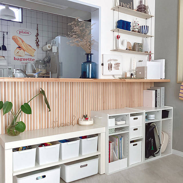 対面カウンターの下に、オープンタイプの棚をDIYされたCHIBIHAHAさん。ティッシュなどの小物類はここにすべて置くことができ、ダイニングテーブルの上がすっきりと片付きます。扉がなく、ワンアクションで出し入れできるのもいいところ。バスケットやボックスの選び方も参考になりますね。