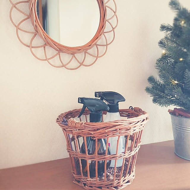 ラタンのカゴに、除菌スプレーを入れているユーザーさんの実例です。生活感の出やすいアイテムが、お部屋に馴染んでいますね。使う頻度が多いものほど、入れるだけのポイポイ収納は便利です。ラタンのミラーとの統一感もあり、やさしさのあるインテリアに仕上がっています。