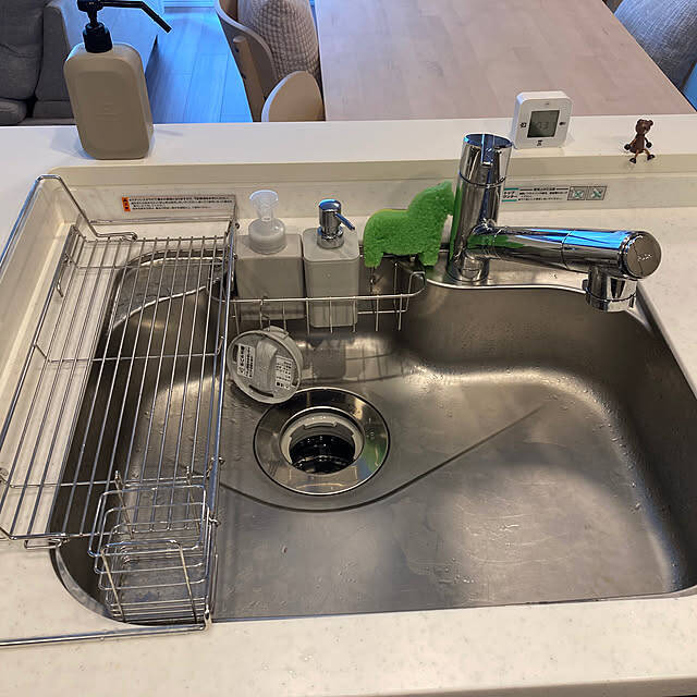 towerのスリムツーウェイ水切りワイヤーバスケットを購入したという、mashnowさん。スペースが限られているシンクを、またぐように設置できるスリムな水切りラックです。取っ手部分にタオルも通すことができて、タオル掛けがないシンクでも活躍してくれます。