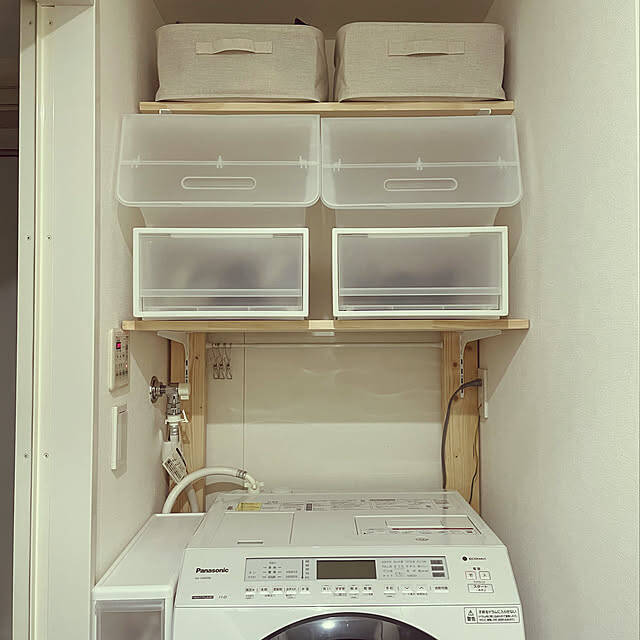 こちらの実例では、洗濯機の後ろ側にディアウォールを設置して、二段のウォールシェルフを作っています。棚板にはそれぞれケースを入れていて、清潔感もばっちりですね。高い位置にある真ん中のボックスは正面開閉のフタで特に取り出しやすそうです。