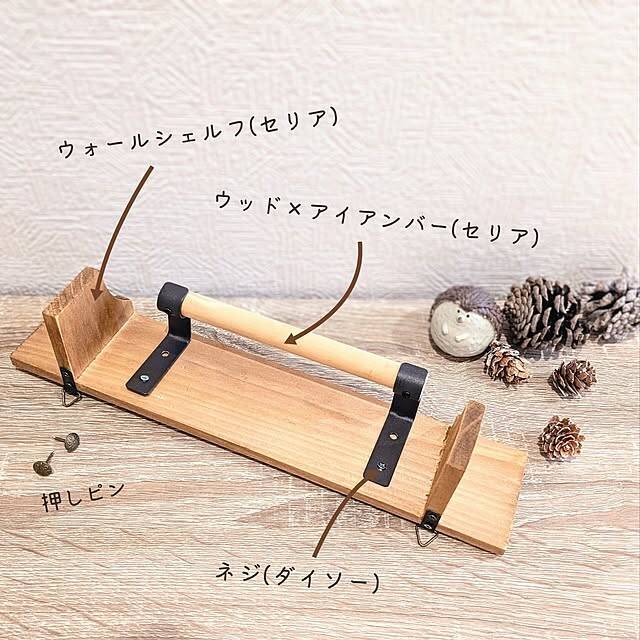 ウォールシェルフ【Seria(セリア) 売場:装飾品】ウッド×アイアンバー【Seria(セリア) 売場:装飾品】ネジ【ダイソー 売場:DIY材(スノコ、工具、フック等)】石膏ボード用プッシュピン(3つ穴)【ダイソー 売場:DIY材(スノコ、工具、フック等)】■必要な道具