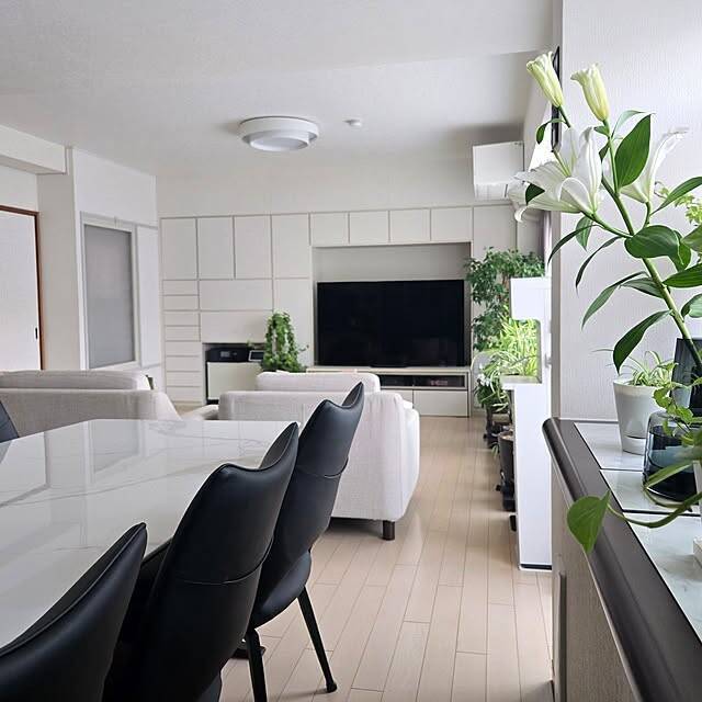 love1017さんのリビングダイニングは、モノトーンで統一したシンプルでスタイリッシュな空間。ホワイトの分量が多めなので、爽やかで清潔感のあるイメージですね。テーブルや床には、物を置かないように気を付けているそう。窓辺のグリーンの効果で、リラックス感もアップしています。