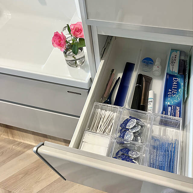 Hannahさんは、洗面室の引き出し収納に「クリアケースダブル」を活用されています。真ん中に仕切りが付いているので、綿棒やコットン、コンタクトレンズなどを1つのケースで仕分けできてとっても便利。クリア素材なので、フタを開けずに中身が確認できるところも衛生的で使いやすいポイントです。