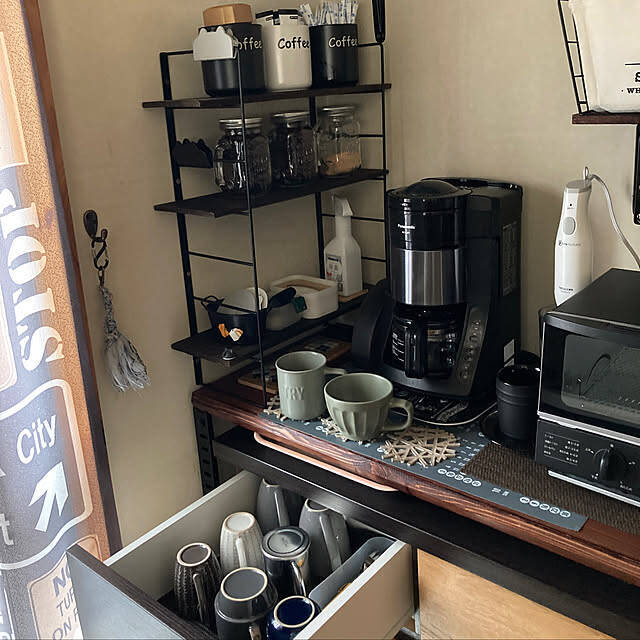 sobateaさんがコーヒーグッズを収納するために使ったのは、セリアのパズルボードです。自分の好きな形に組み立てられるので、収納したいコーヒーグッズのサイズに合わせられますよ。見た目も使い勝手もよい、オープン収納ですね。
