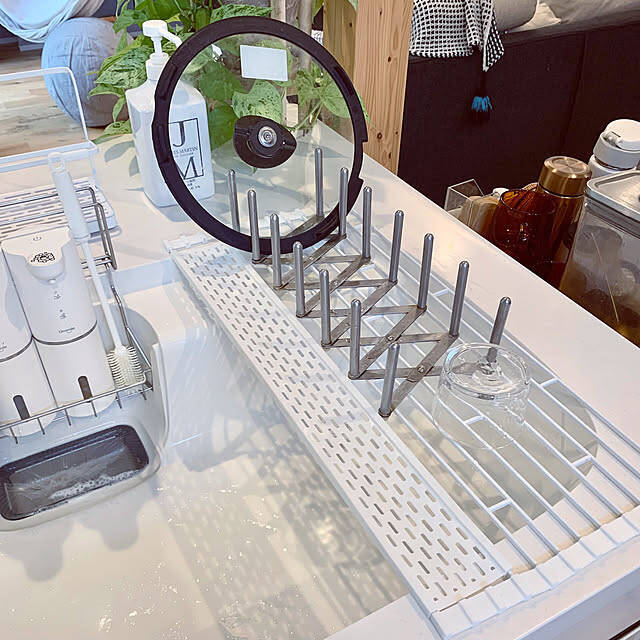 Minteaさんは、山崎実業の折りたためる水切りラックと、IKEAの鍋ぶたスタンドを活用されていました。どちらも使わないときはたためるため、シンクまわりを広く使えますよ。シンクに水が落ちるため、水受けが不要なのも便利ですね。ラックにはトレーが付属しているため、小物も安心して乾かせますよ。