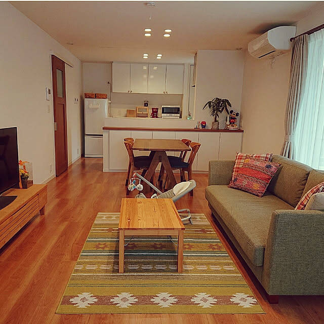 こちらの実例では、パイン材の折りたたみローテーブルをリビングに設置しています。大きすぎず小さすぎないサイズ感で、広々したリビングを演出してくれていますね。フローリングの床にもテイストがぴったり合っています。柄物のラグも映えますね。