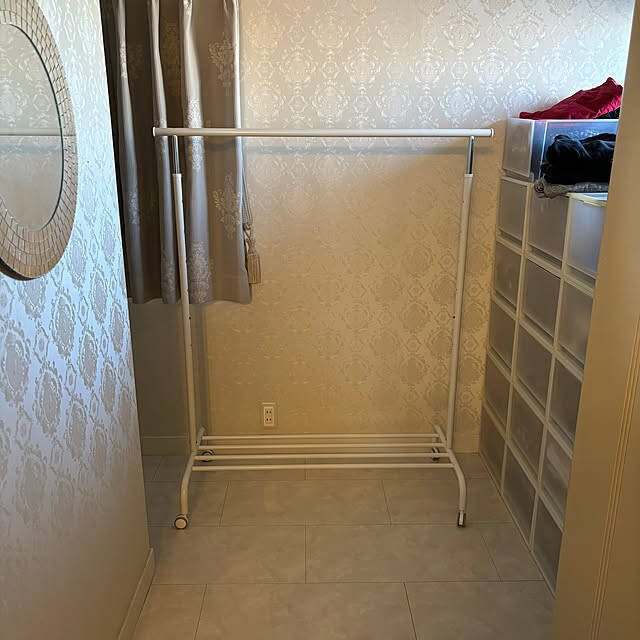 収納が足りなくなってしまったというakanejewelerは、IKEAのリッガを購入しました。服を掛ける場所が簡単に増やせますよ。ホワイトを選んでいるのですっきりとして見えますね。下にもラックが付いており、バッグや収納ボックスを置いたり収納力も抜群です。