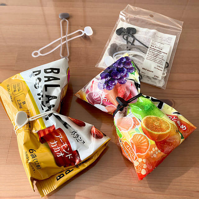 yocchanさんのお気に入りは、無印良品の「シリコーンバルチバンド」です。このように、食べかけのお菓子の袋などを閉じたいときに、輪ゴム感覚で使うことができます。冷凍や湯せんもOKなので、生鮮食品の保存や調理にも便利そう。輪ゴムよりも切れにくく、繰り返し使えてコスパも◎です。