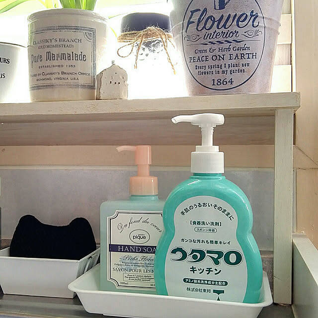 faunさんは、「ウタマロキッチン」をキッチンの食器洗剤として新調しています。食器の油落ちがいいのに手の潤いはしっかりキープしてくれるそう。使い心地のよさを実感されていますよ。ウタマロカラーに合わせてハンドソープもおそろいのカラーを選ぶなど、快適なキッチンづくりも参考になります。