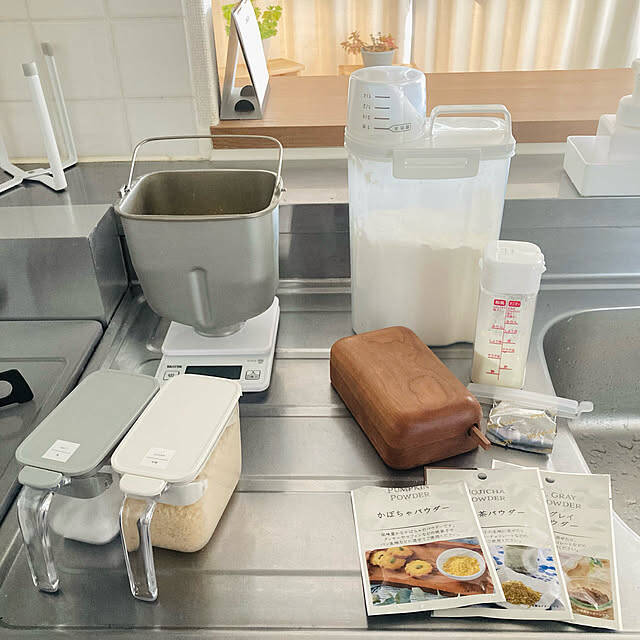 パン作りを楽しまれているユーザーさん。材料の強力粉を入れているのは、ホームコーディのライスストッカーです。こちらは中身をサッと注げ、冷蔵庫などにも収納しやすいボトルタイプです。強力粉1キロを入れられ、計量も詰め替えも楽々。ハンドル付きなので冷蔵庫からも取り出しやすいそうですよ。