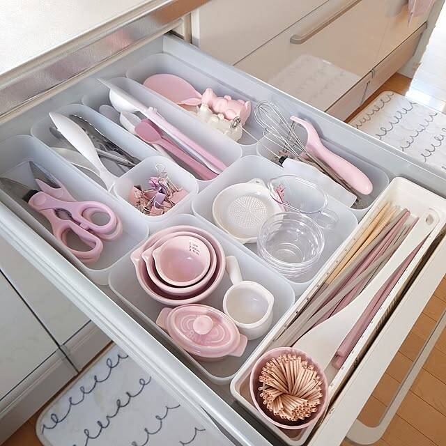 yukaさんは、セリアのプラスチックケースをキッチンの引き出しで使っています。サイズもいろいろあるので、自分に合った収納ができるところがお気に入りとのこと。ケースで仕切りを作っていることで、整理しやすくなるように工夫されていますね。