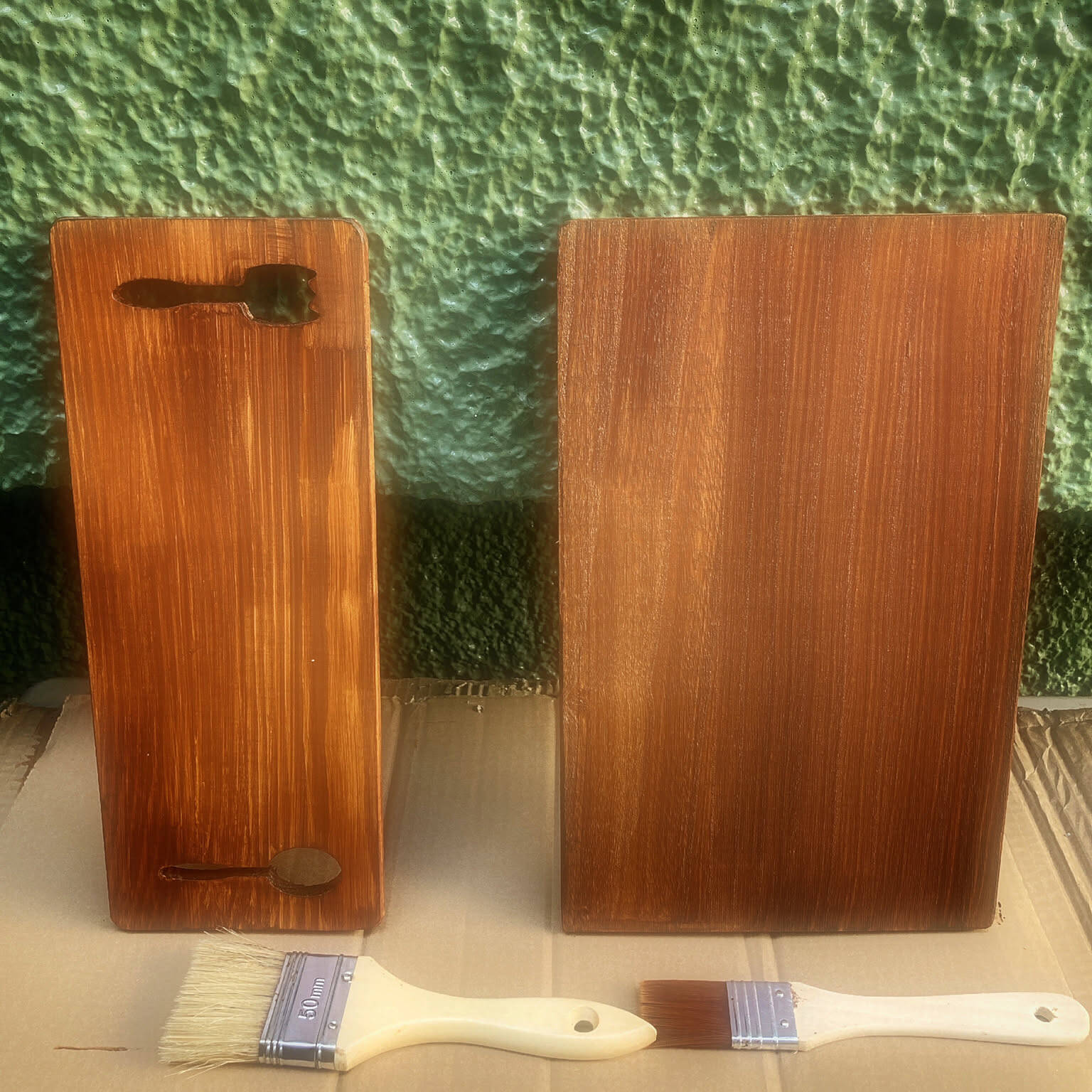 はじめに、桐まな板(写真右側)に水性ニス(メープル)を重ね塗りし、乾かします。※乾燥に掛かる時間は所要時間に含まれていません。尚、写真左側はダイソーのランチウッドカッティングボードです。