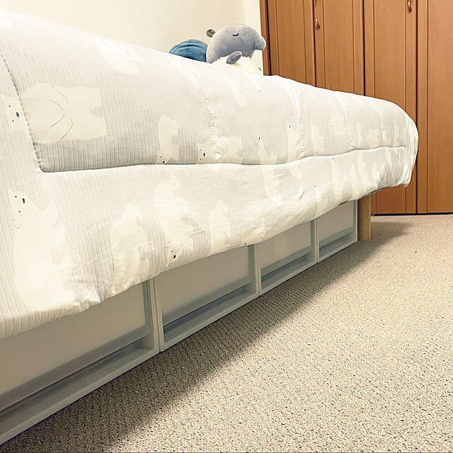 こちらは、kawauso15さんの娘さんのお部屋です。無印良品のベッドの下にぴったり収まっているのは、同じく無印良品のポリプロピレン衣装ケース。クローゼットに入りきらないお洋服を収納しているそうです。高さ18cmの薄型ですが、奥行きが十分にあるので収納力抜群だそうですよ。
