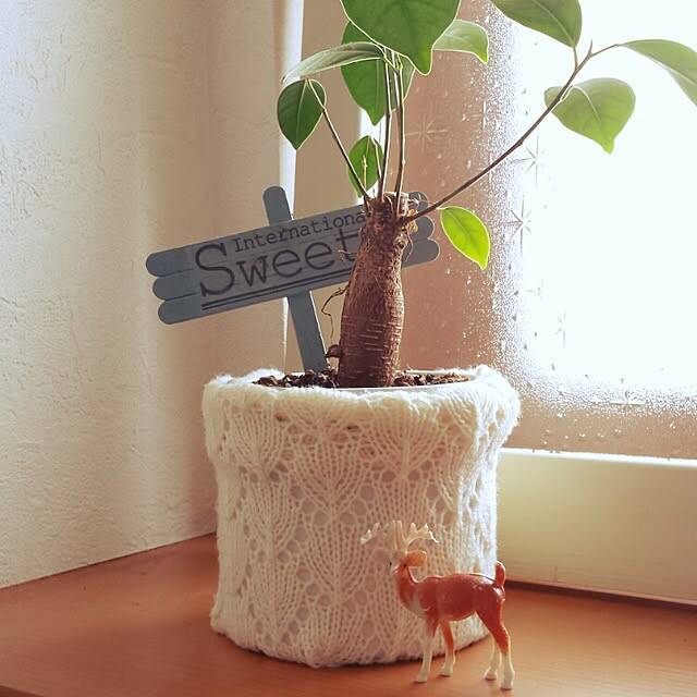 着なくなったセーターを使って、鉢カバーを手作りされているユーザーさん。編み目の模様がそのまま鉢のデザインになっていて、見た目もやさしい雰囲気です。看板のガーデンピックや動物の置きものをプラスして、ナチュラルな空間に仕上がっています。