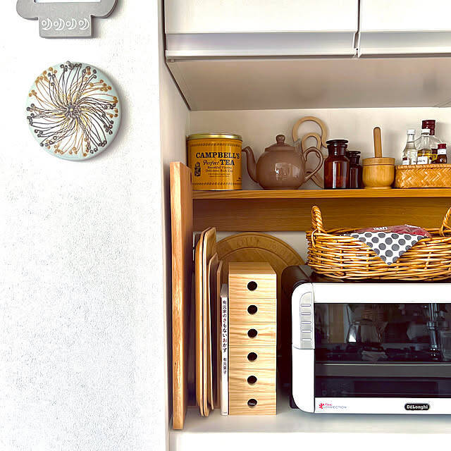 小さな引き出しが細かい物の整理に便利な、「木製小物収納6段」。ユーザーさんはキッチンの棚に縦置きにして、飲み薬を収納するのに使用されているそうです。同シリーズの「木製収納スタンド」を組み合わせているのもgood。トレーや料理本をすっきり立てて収納されています。