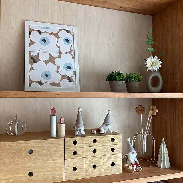 ユーザーさんは、「木製小物収納1段」を2つ重ねて、カフェスペースに設置。コーヒースティックやカプセルを収納するのに活用されています。こちらの引き出しは、仕切り板で中の幅を調整できるのも使いやすいところ。ごちゃつきやすい小物も、すっきり整理整頓できますね。