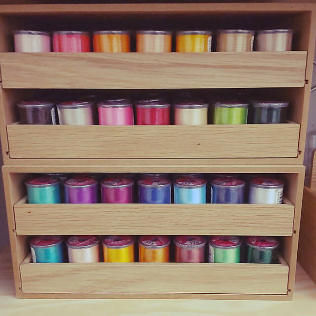 トレーの手軽さとボックスの収納力をあわせ持った「木製トレー収納2段引出」。トレーの上が程よく空いていて、引き出さなくても中身を確認できるのが特徴です。ユーザーさんはミシン糸の収納に使用されていますよ。これなら使いたい糸を見つけやすいので、効率よく作業ができそうですね。