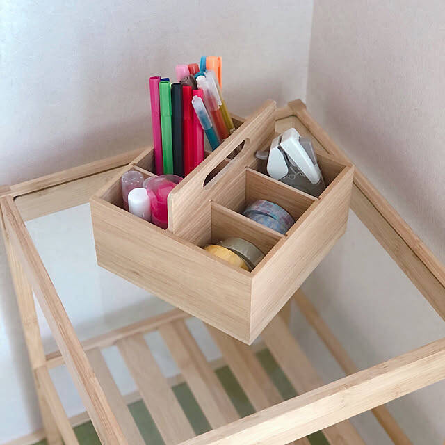持ち手付きで持ち運びに便利な「木製ツールボックス」です。ユーザーさんはマーカーやマスキングテープなどの文房具入れとして活用されています。仕切りは可動式なので、収納する物に合わせて調整可能。お子さんたちがお絵描きするときも、そのままテーブルにサッと移動して使えるそうですよ。